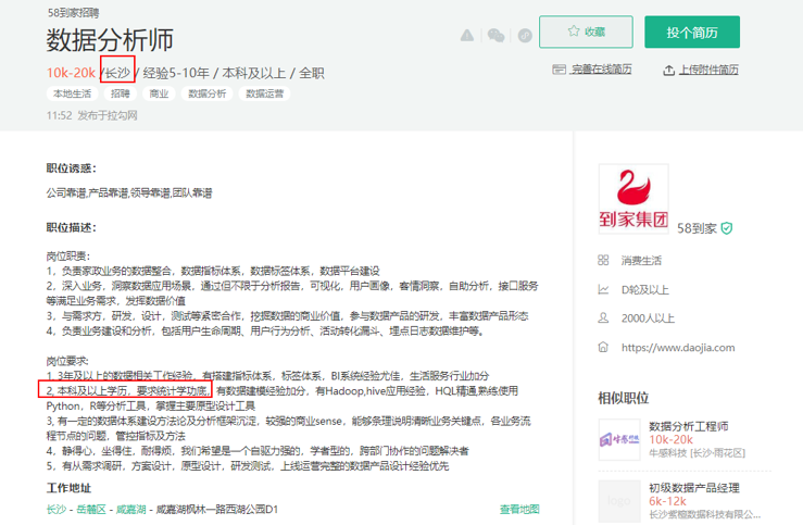 落标长沙,大数据人才招聘底薪10K起步,这是相当惊人的工资,下面再看岗位具体要求:需要有统计学功底。