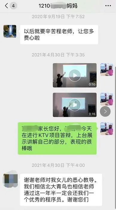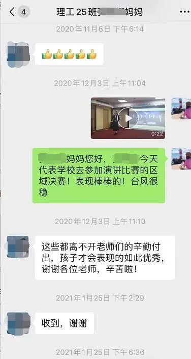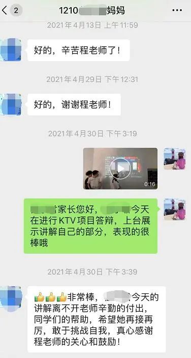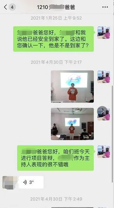 ——程芳老师:和学生家长平时都是定期沟通,学生如果有异动会第一时间和家长反馈。因为有很多家长在外地上班没办法陪在孩子身边,所以学生在学校参加演讲、答辩等各种活动时,我都会用照片、视频及时发给家长们,让他们能够知道孩子在校表现和见证孩子成长。我相信只要做好各项工作,家长们是会看到和感受到老师的用心的。